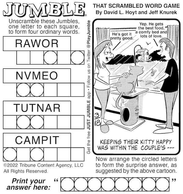 Play this week’s Jumble with noisy cows and a happy cat. Unscramble the words and the humorous bonus answer. Start with the Jumble for Kids as a warm-up – or share the challenge with a favorite youngster.